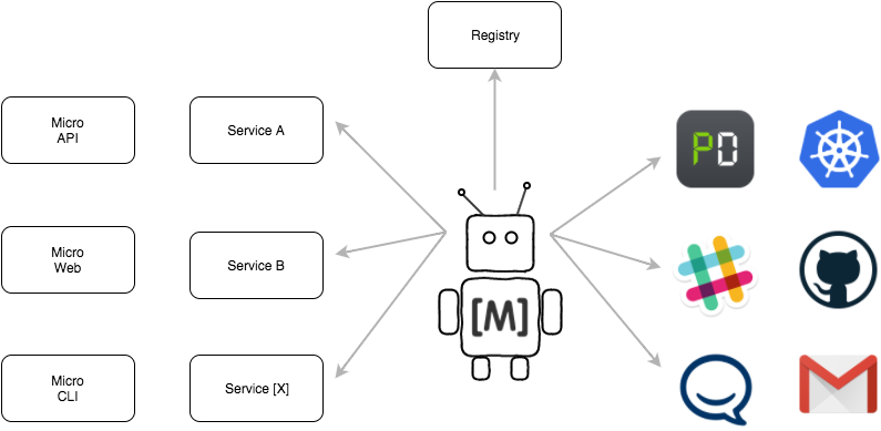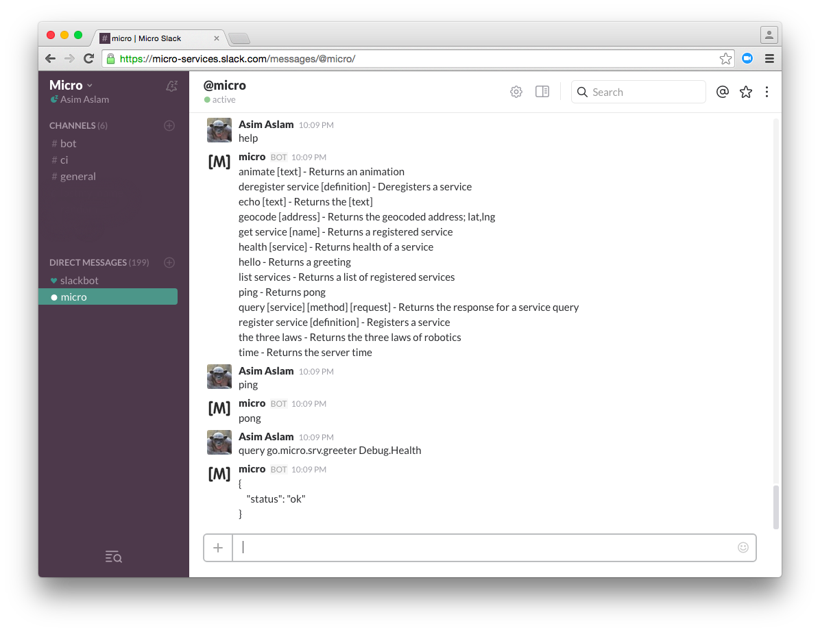 The micro bot is a bot that sits inside your microservices environment which you can interact with via Slack, HipChat, XMPP, etc. It mimics the functions of the CLI via messaging.